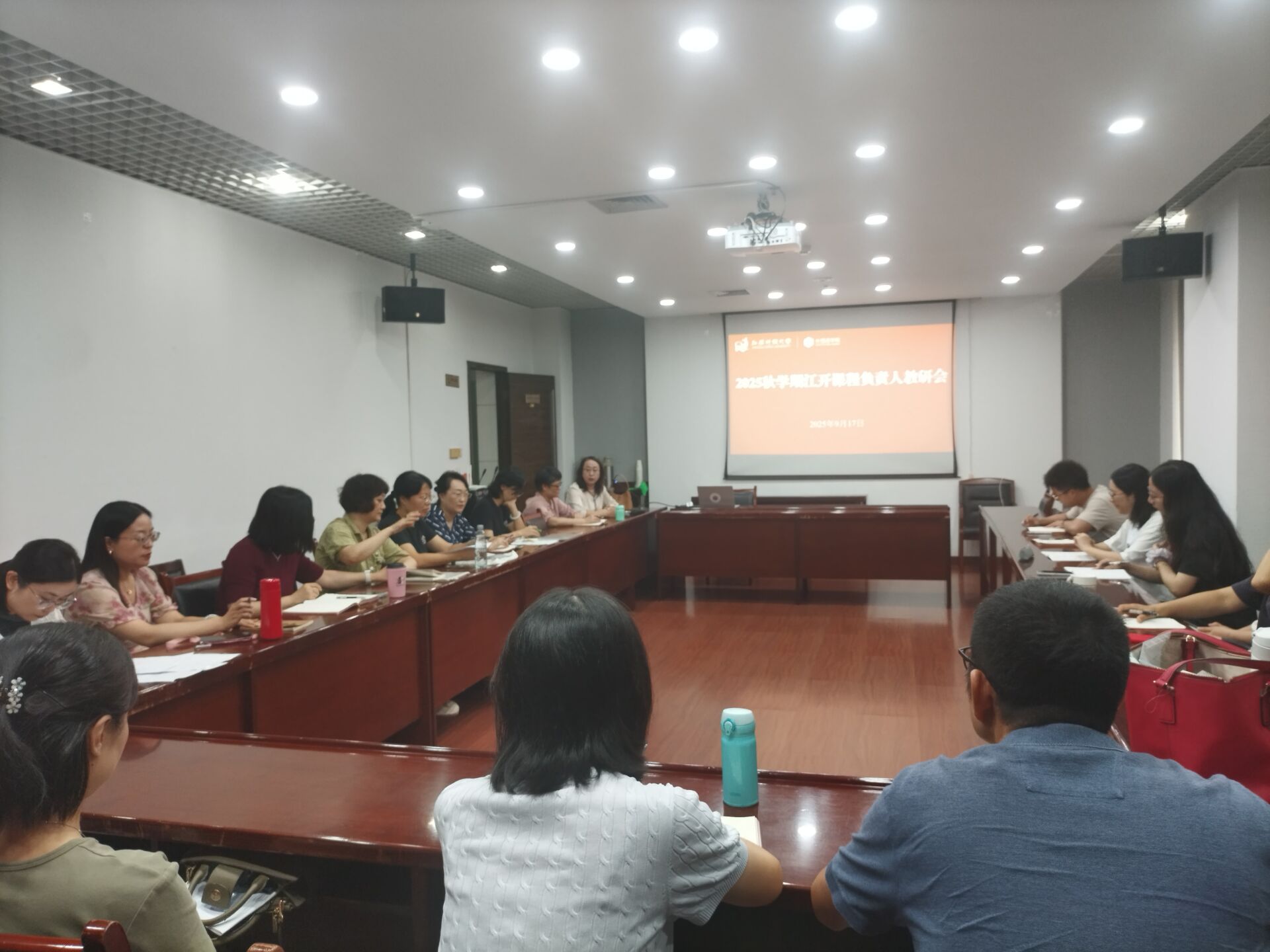 9月17日下午,外国语学院在定淮门校区综合楼二楼第三会议室召开了一场以“强化教学质量生命线”为主题的开放教育课程负责人期初教研会。学院院长孙雁冰、院长助理刘姮、学院督导组成员、全体开放教育课程负责人及开放教学秘书共同聚焦教学规范与质量提升,为新学期教学工作锚定方向。